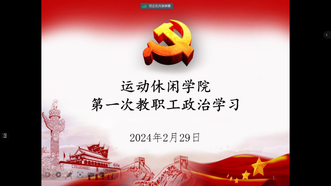 为进一步巩固拓展主题教育成果,认真贯彻落实省纪委十二届三次全会精神,深入学习贯彻学校第十二次党代会精神,更好地完成学校2024年各项工作,持续推进学校事业高质量发展,运动休闲学院于2024年2月29号中午以线上的方式开展了2024年第一次教职工政治学习。
