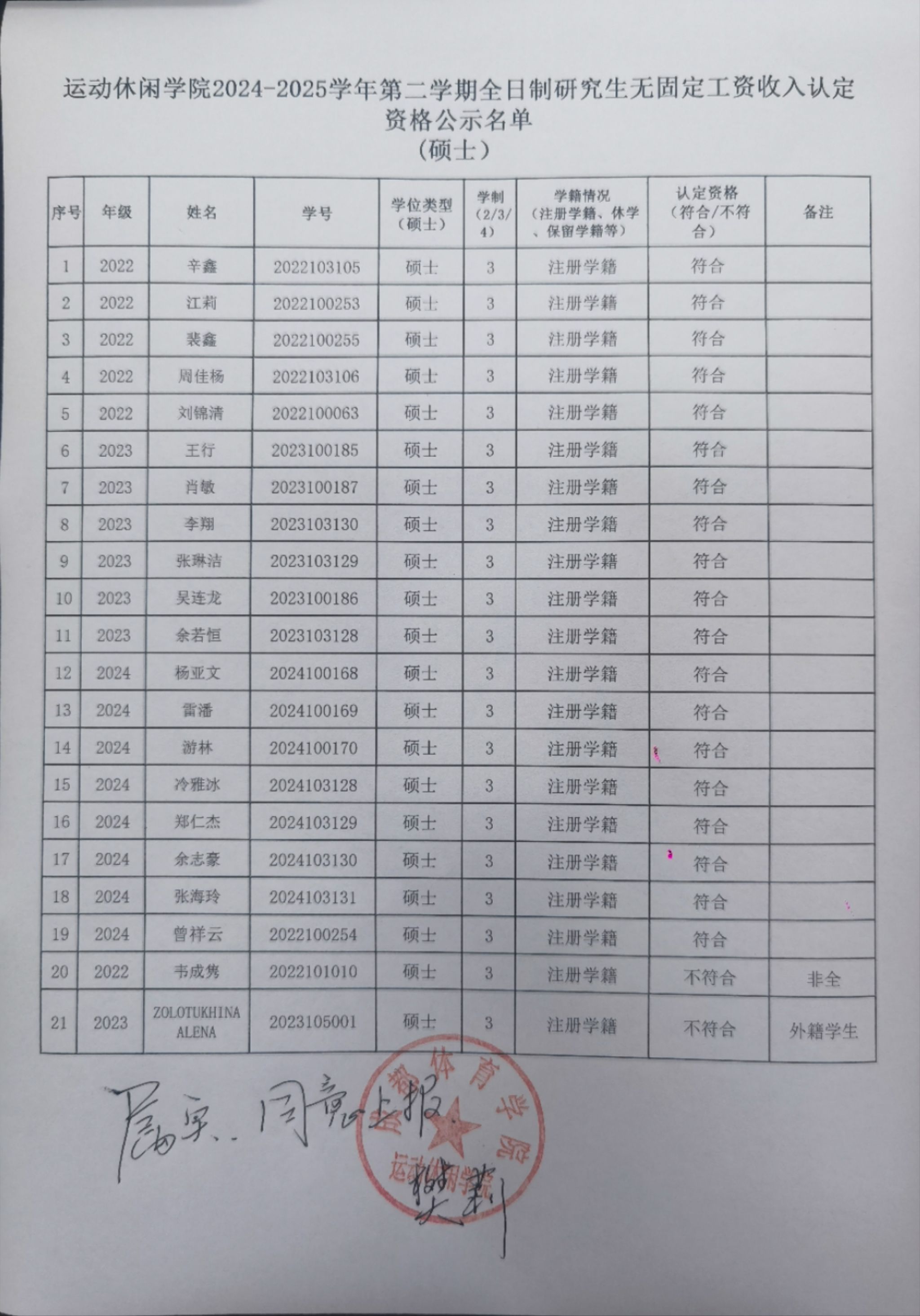 运动休闲学院2024-2025学年第二学期全日制研究生无固定工资收入认定资格公示名单