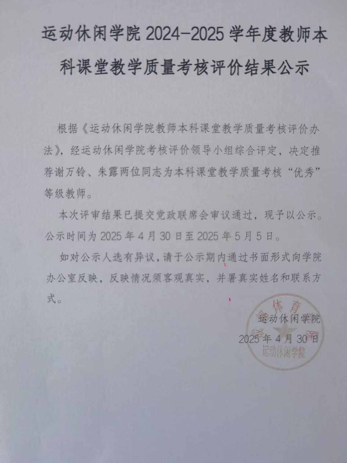 运动休闲学院2024-2025学年度教师本科课堂教学质量考核评价结果公示